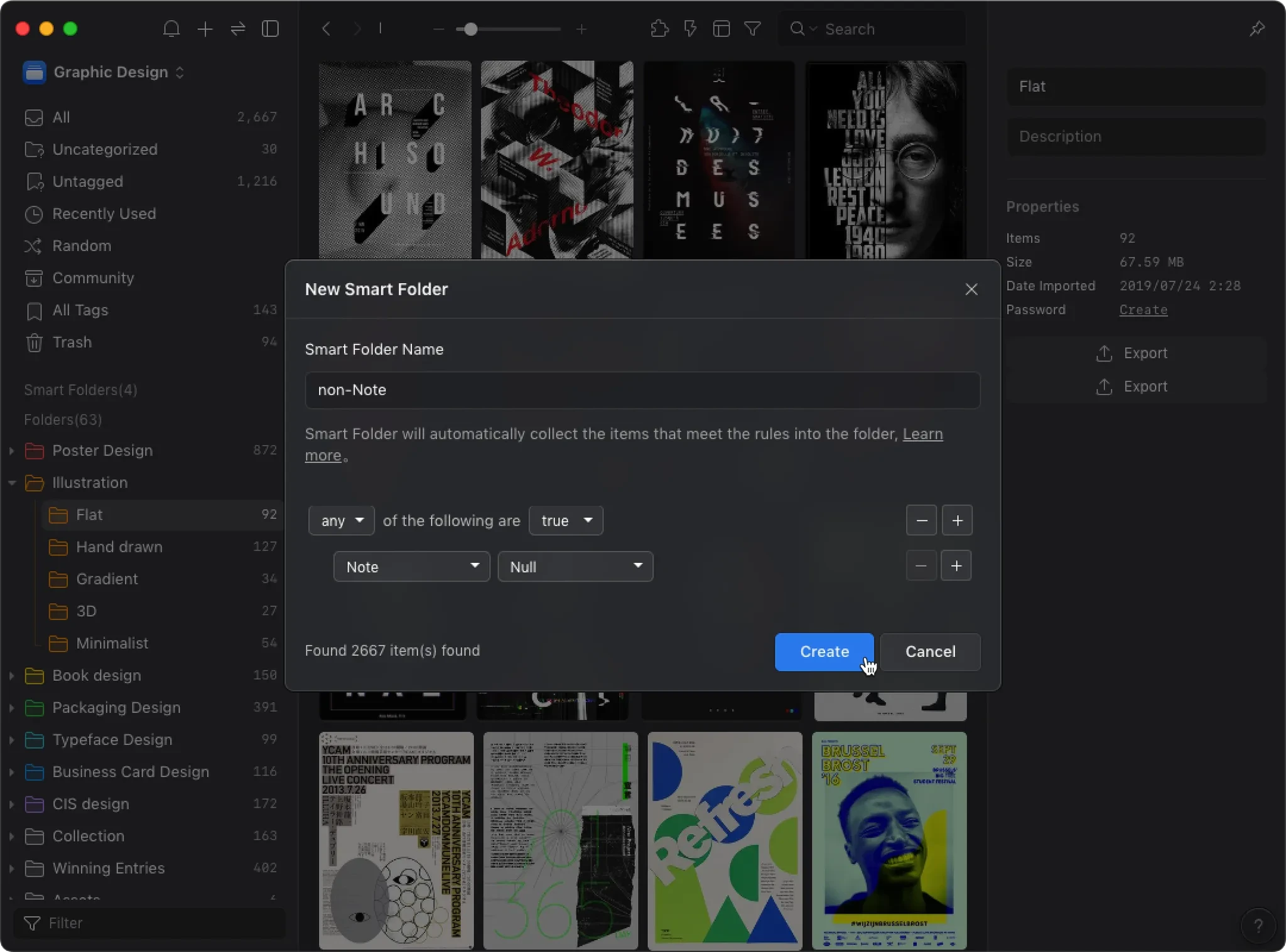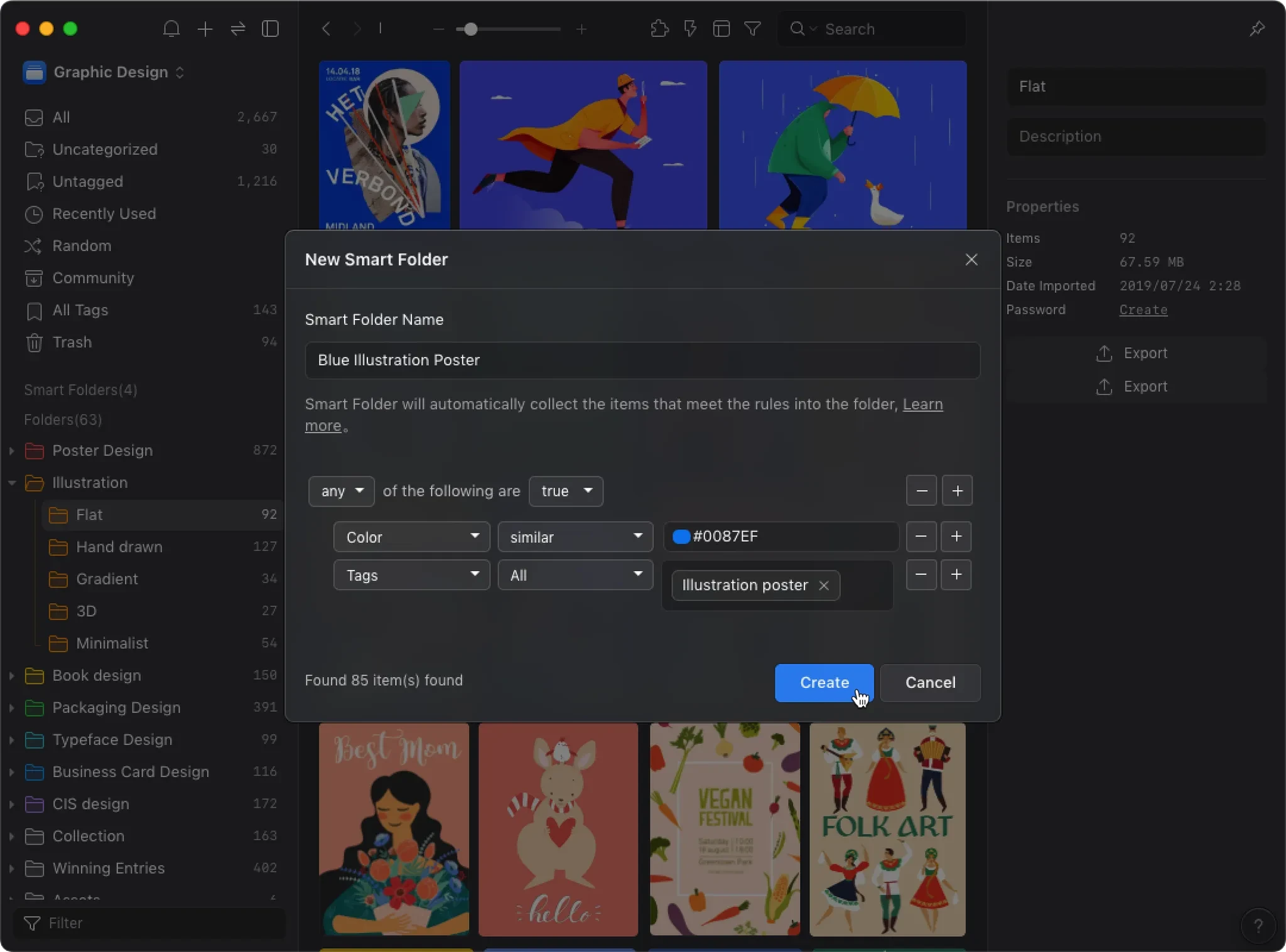 Eagle’s Smart Folders function like intelligent virtual folders. By defining custom filtering rules, Smart Folders automatically search and compile all matching assets instantly. Unlike traditional folders, you don’t manually move assets into Smart Folders; instead, Eagle dynamically categorizes them based on set criteria. Once configured, these folders continue to update automatically with new matching files—set once, benefit forever.